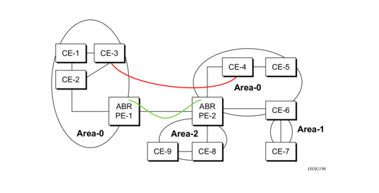 Figure 7 displays the red link between CE-3 and CE-4 could be a low speed OC-3/STM-1 link but because it establishes a intra-area route connection between the CE-3 and CE-4 the potentially high-speed PE-1 to PE-2 connection will not be utilized. Even with a super backbone configuration it is regarded as a inter-area connection.