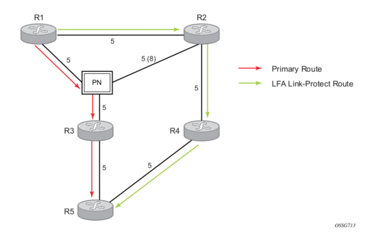 This feature provides for the use of the Loop-Free Alternate (LFA) backup next-hop for forwarding in-transit and CPM generated IP packets when the primary next-hop is not available. This means that a node resumes forwarding IP packets to a destination prefix without waiting for the routing convergence.