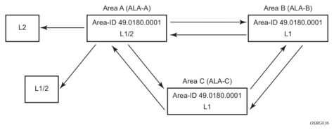 Nokia’s implementation of IS-IS route leaking is performed in compliance with RFC 2966, Domain-wide Prefix Distribution with Two-Level IS-IS. As previously stated, IS-IS is a routing domain (an autonomous system running IS-IS) which can be divided into Level 1 areas with a Level 2-connected subset (backbone) of the topology that interconnects all of the Level 1 areas. Within each Level 1 area, the routers exchange link state information. Level 2 routers also exchange Level 2 link state information to compute routes between areas.