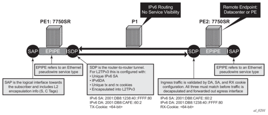 Epipe services are point-to-point Layer 2 VPNs capable of carrying any Ethernet payloads. Although an Epipe is a Layer 2 service, the 7450 ESS, 7750 SR, and 7950 XRS Epipe implementation does not perform any MAC learning on the service, so Epipe services do not consume any MAC hardware resources.