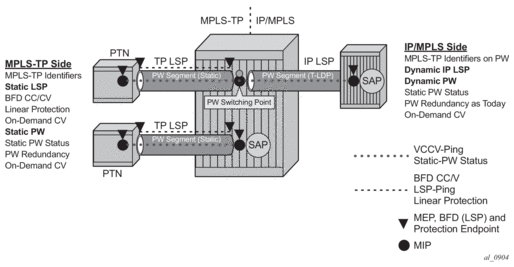 On the MSC-located SR connected to the Radio Network Controller (RNC), there is a standard pseudowire (Ethernet or ATM) that has an active pseudowire by IP/MPLS, but the standby path is not IP/MPLS capable Therefore, the active/standby pseudowire concept is extended to allow standby to be an access SAP to an ATM network for ATM pseudowire or Ethernet (bridged over ATM) for ETH pseudowire.