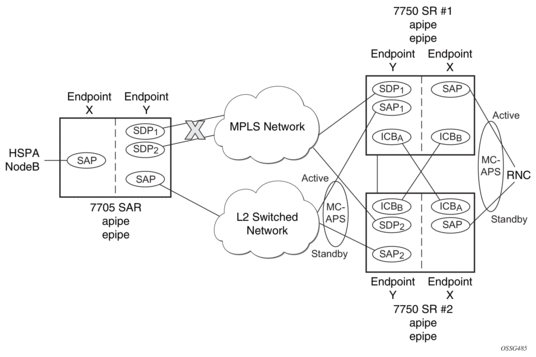For HSDPA, Apipe and Epipe service termination on the SR where an endpoint-X SAP connects to the mobile RNC (by ATM or Ethernet) and an endpoint Y has a primary spoke-SDP and a secondary SAP on an SR ATM or ASAP MDA (with bridged PDU encapsulation for Epipes). The secondary SAP has the same restrictions as the SAP in endpoint-X for Apipe and Epipe, respectively.
