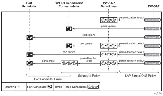 To make use of the agg-rate rate or port-scheduler under a Vport, PW SAP queues and schedulers must be configured with the port-parent command. To make use of a scheduler under a Vport, PW SAP schedulers must be configured with a parent command and the parent-location vport under the tier 1 of the scheduler policy. The egress hierarchical parenting relationship options are shown in Figure 4. See the 7450 ESS, 7750 SR, and 7950 XRS Quality of Service Guide Quality of Service guide for more information.
