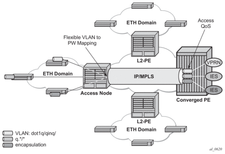 This feature provides the ability to cross-connect traffic entering on a spoke SDP, used for Layer 2 services (VLLs or VPLS), on to an IES or VPRN service. From a logical point of view, the spoke SDP entering on a network port is cross-connected to the Layer 3 service as if it entered by a service SAP. The main exception to this is traffic entering the Layer 3 service by a spoke SDP is handled with network QoS policies not access QoS policies.
