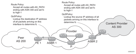 Figure 2 shows an example of an ISP that has an agreement with the content provider managing AS300 to provide traffic sourced and terminating within AS300 with differentiated service appropriate to the content being transported. In this example, we presume that ASBR1 and ASBR2 mark the DSCP of packets terminating and sourced, respectively, in AS300 so that other nodes within the ISP’s network do not need to rely on QPPB to determine the correct forwarding-class to use for the traffic. The DSCP or other CoS markings could be left unchanged in the ISP’s network and QPPB used on every node.