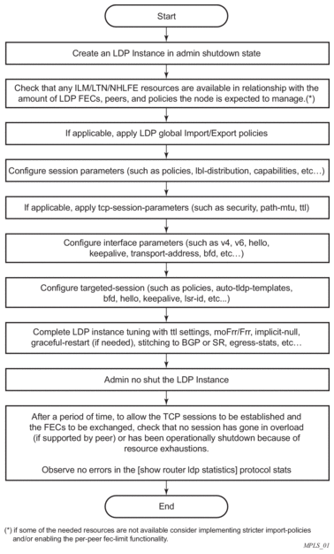 LDP makes sure that the various prerequisites, such as ensuring the system IP interface is operational, the label manager is operational, and there is memory available, are met. It then allocates itself a pool of memory and initializes its databases.