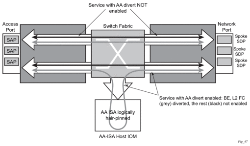 A key benefit if integrating AA in the existing IP/MPLS network infrastructure (as opposed to an in-line appliance) is the ability to select traffic for treatment on a granular, reliable basis. Only traffic that requires AA treatment is simply and transparently diverted to the ISA. Other traffic from within the same service or interface will follow the normal forwarding path across the fabric. In the case of ISA failure, ISA redundancy is supported and in the case no backup ISAs are available the AA traffic reverts to the normal fabric matrix forwarding, also known as “fail to fabric”.
