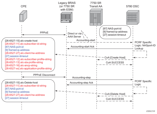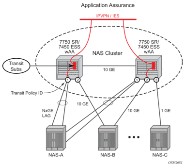 There are residential topologies where it is not possible or practical to distribute ISAs into the same network elements that run ESM, including for legacy edge BRASs that still need Application Assurance policy (reporting and control) for the same Internet services, and which needs to be aligned and consistent with the ESM AA policy. This is supported using transit AA subscribers, typically in the first routed element behind the legacy edge.