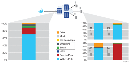 Integrating Layer 4-7 application policy with the 7750 SR or 7450 ESS subscriber edge policy context is the primary solution to address both residential broadband edge or Layer 2/Layer 3 application aware business VPN. Placement of Layer 4-7 analysis at the distributed subscriber edge policy point simplifies AA deployments in the following ways: