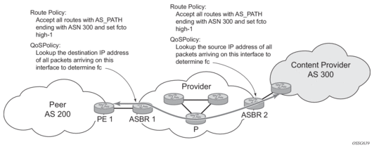Figure 1 shows an example of an ISP that has an agreement with the content provider managing AS300 to provide traffic sourced and terminating within AS300 with differentiated service appropriate to the content being transported. In this example, ASBR1 and ASBR2 mark the DSCP of packets terminating and sourced, respectively, in AS300 so that other nodes within the ISP’s network do not need to rely on QPPB to determine the correct forwarding-class to use for the traffic. The DSCP or other COS markings could be left unchanged in the ISP’s network and QPPB used on every node.