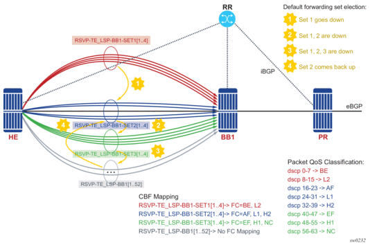 Both the BGP or CPM application and IOM use the same algorithm for failover and default class-forwarding set determination, as described in Feature Behavior and illustrated in Example Configuration and Default CBF Set Election.