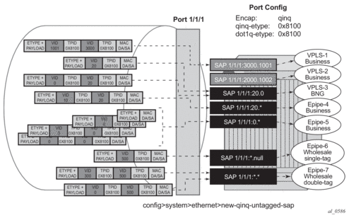 As shown in Figure 8, assuming that the new-qinq-untagged-sap command is enabled, the following SAPs are defined on the same port: