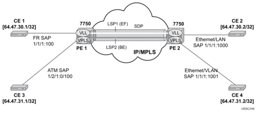 In the Nokia router services can provide Layer 2 bridged service or Layer 3 IP-routed connectivity between a service access point (SAP) on one router and another service access point (a SAP is where traffic enters and exits the service) on the same (local) router or another router (distributed). A distributed service spans more than one router.