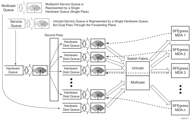 Ingress multipoint shared queuing is a variation to the unicast shared queuing defined in Ingress Shared Queuing on page 15. Ingress unicast service queues are mapped one-for-one with hardware queues and unicast packets traverse the ingress forwarding plane twice. In addition to the above, the multipoint queues defined in the ingress SAP QoS policy are not created. Instead, multipoint packets (broadcast, multicast and unknown unicast destined) are treated to the same dual pass ingress forwarding plane processing as unicast packets. In the first pass, the forwarding plane uses the unicast queue mappings for each forwarding plane. The second pass uses the multipoint shared queues to forward the packet to the switch fabric for special replication to all egress forwarding planes that need to process the packet.