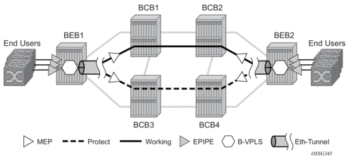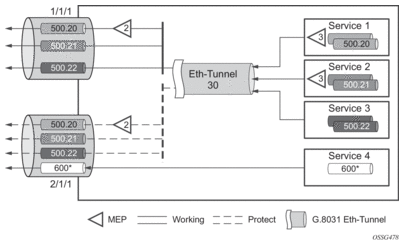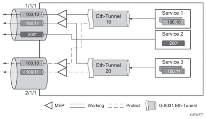 In the implementation, the Ethernet tunnel is a logical interface for a SAP defined Layer 2 service similar to a LAG. The implementation offers ITU G.8031 1:1 compliance as well as some added capabilities such as fate sharing and emulated LAG support.