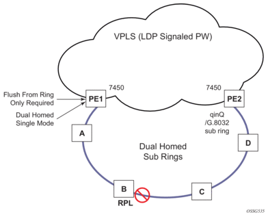 The 7450 ESS, 7750 SR, and 7950 XRS allow for a special configuration of the non-virtual link sub-ring that can be homed to a VPLS service illustrated in Figure 25. This is an economical way to have a redundant ring connection to a VPLS service. This is currently supported only for dot1Q and QinQ sub-rings and only on LDP based VPLS. The primary application for this is access rings that require resiliency. This configuration shows the configuration for a sub-ring at an interconnection node without a virtual channel and interconnected to a VPLS. A VPLS service 1 is used to terminate the ring control. The Ethernet ring data SAP appears in the associated LDP based VPLS service 5.
