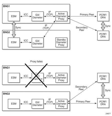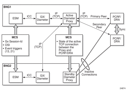 Figure 228 illustrates the basic concept for Diameter Multi-Chassis Redundancy for a Gx application. The model shows two nodes (BNGs). Each BNG contains an ESM module and a Gx/Diameter module which have a peering connection to the active Diameter proxy module. The peering connections are IP connections. Both nodes communicate with the PCRF/DRA through the active Diameter proxy which maintains a peering connection with the PCRF/DRA.