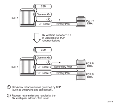 The handling of Diameter retransmissions is crucial for the Diameter Multi-Chassis Redundancy operation. Retransmissions provide the means to recover a Diameter session that was left in an unacknowledged state due to failure of the path between the node and the DRA/PCRF.
