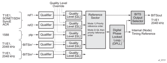 In Time Domain Multiplexed (TDM)-based networks (for example, SONET or SDH circuit- switched networks), the concept of network timing is used to prevent over-run or under-run issues where circuits are groomed (rebundled) and switched. Hardware exists in each node that takes a common clock derived from an internal oscillator, a specific receive interface, or special BITS interface and provides it to each synchronous interface in the system. Usually, each synchronous interface is allowed to choose between using the chassis-provided clock or the clocking recovered from the received signal on the interface. The clocking is used to drive the transmit side of the interface. The appropriate configuration at each node which defines how interface clocking is handled must be considered when designing a network that has a centralized timing source so each interface is operating in a synchronous manner.