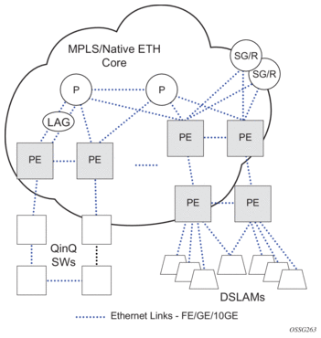 The example displayed in Figure 26 depicts a MPLS network that uses Ethernet interfaces in the core or as an access/hand off interfaces to connect to different kind of Ethernet enabled devices such as service gateway/routers, QinQ switches, DSLAMs or customer equipment.