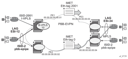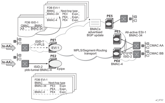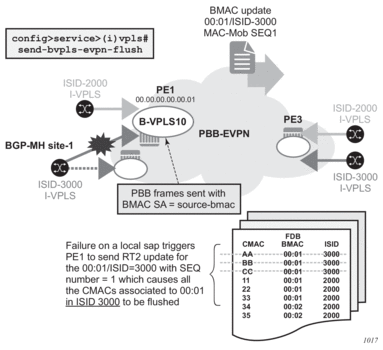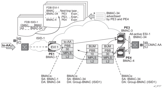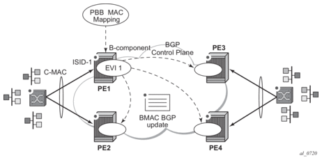 PBB-EVPN is a combination of 802.1ah PBB and RFC 7432 EVPN and reuses the PBB-VPLS service model, where BGP-EVPN is enabled in the B-VPLS domain. EVPN is used as the control plane in the B-VPLS domain to control the distribution of BMACs and setup per-ISID flooding trees for I-VPLS services. The learning of the CMACs, either on local SAPs/SDP-bindings or associated with remote BMACs, is still performed in the data plane. Only the learning of BMACs in the B-VPLS is performed through BGP.