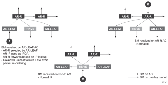The preceding described behavior and the use of tags is also valid for vsi-import and vsi-export policies in the R-VPLS.