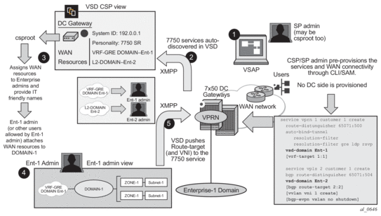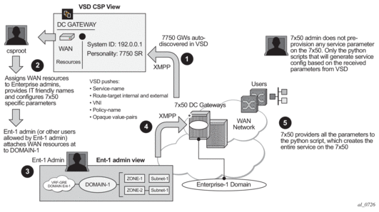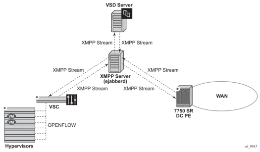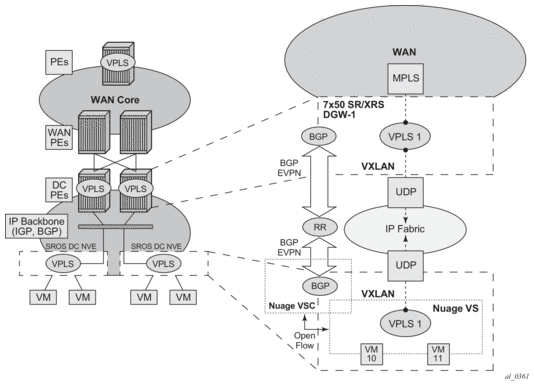The 7750 SR, 7450 ESS, or 7950 XRS EVPN VXLAN implementation is integrated in the Nuage Data Center architecture, where the router serves as the DC GW.