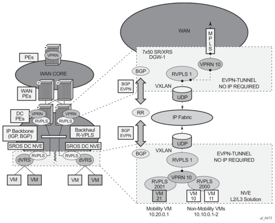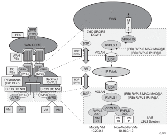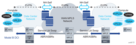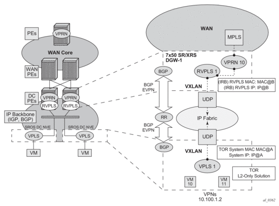 The 7750 SR, 7450 ESS (in mixed mode), and 7950 XRS DC GW support the IRB backhaul R-VPLS model, where the R-VPLS runs EVPN-VXLAN and the VPRN instances exchange IP prefixes (IPv4 and IPv6) through the use of EVPN. Interoperability between the EVPN and IP-VPN for IP prefixes is also fully supported.