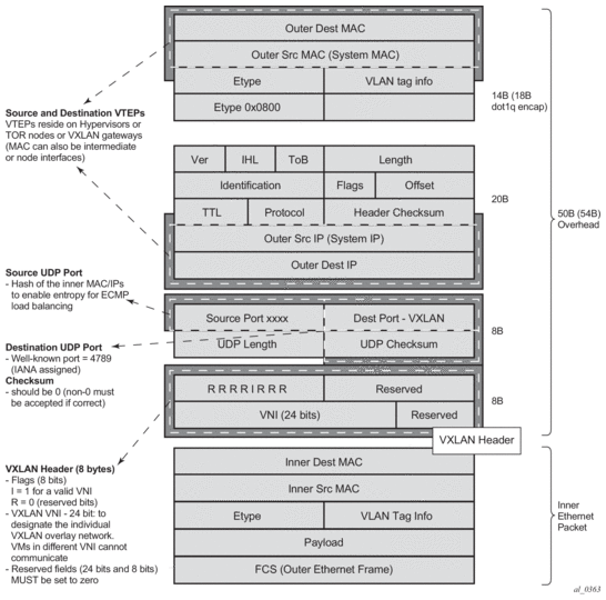 As shown in Figure 144, VXLAN encapsulates the inner Ethernet frames into VXLAN + UDP/IP packets. The main pieces of information encoded in this encapsulation are: