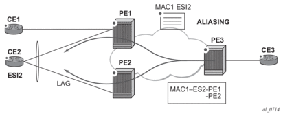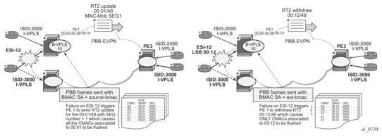 | Note: When EVPN multi-homing is used in EVPN-MPLS, the ESI is compared to determine whether a MAC received from two different PEs has to be processed within the context of MAC mobility or multi-homing. Two MAC routes that are associated with the same remote or local ESI but different PEs are considered reachable through all those PEs. Mobility procedures are not triggered as long as the MAC route still belongs to the same ESI. |
