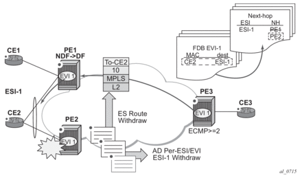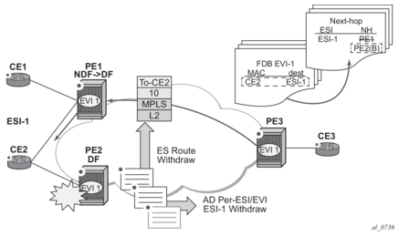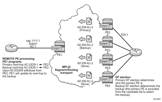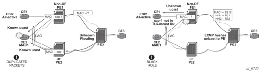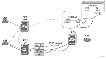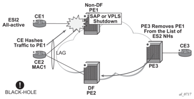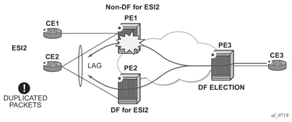 Due to the above considerations, the use of ETH-CFM in EVPN multi-homed SAPs/SDP-bindings is only recommended on operationally down MEPs and single-active multi-homing. ETH-CFM is used in this case to notify the CE of the DF or non-DF status.