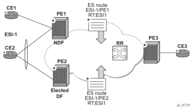 When an I-ES is configured as single-active and is no shutdown with at least one associated service, the DC GWs send ES and AD routes as for any ES and runs DF election as normal, based on the ES routes, with the candidate list being pruned by the AD routes.