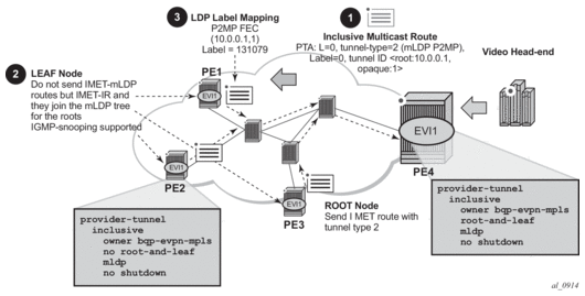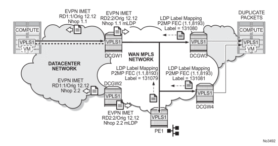 Figure 193 shows an example of a common BGP EVPN service configured in redundant Anycast DC GWs and mLDP used in the MPLS instance.