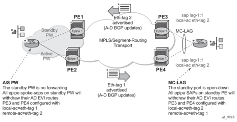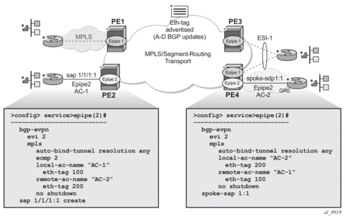 The MPLS network used by EVPN for E-LAN services can also be shared by E-Line services using EVPN in the control plane. EVPN for E-Line services (EVPN-VPWS) is a simplification of the RFC 7432 procedures, and is supported on the 7750 SR, 7450 ESS, and 7950 XRS in compliance with IETF Draft draft-ietf-bess-evpn-vpws.