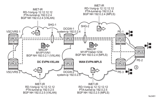 In the example shown in Figure 192, PE-1 will pick up DC GW-1's inclusive multicast route (because of its lower BGP next-hop) and create a BUM destination to 192.0.2.4. When sending BUM traffic for VPLS-1, it will only send the traffic to DC GW-1. In the same way, the DC GWs will not set up BUM destinations between each other as they use the same originating-ip in their inclusive multicast routes.
