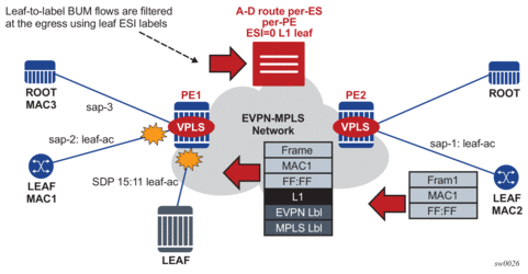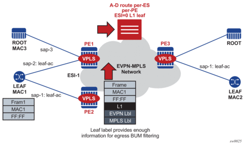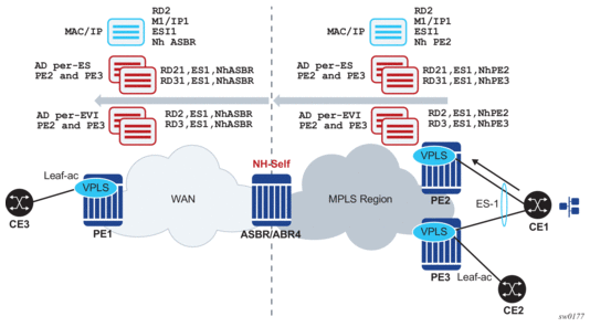 Figure 143 shows the use of EVPN for MPLS tunnels on the 7750 SR, 7450 ESS, and 7950 XRS. In this case, EVPN is used as the control plane for E-LAN services in the WAN.