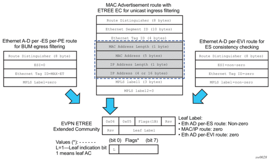 The MPLS network used by E-LAN and E-Line services can also be shared by Ethernet-Tree (E-Tree) services using the EVPN control plane. EVPN E-Tree services use the EVPN control plane extensions described in IETF Draft draft-ietf-bess-evpn-etree and are supported on the 7750 SR, 7450 ESS, and 7950 XRS.