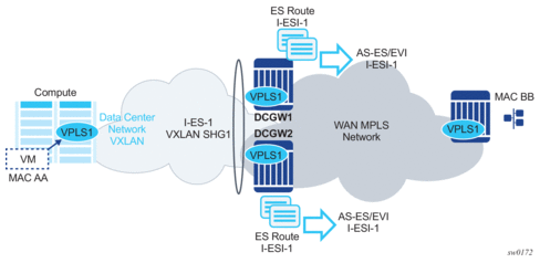 SR OS supports Interconnect ESs (I-ES) for VXLAN as per IETF Draft draft-ietf-bess-dci-evpn-overlay. An I-ES is a virtual ES that allows DC GWs with two BGP instances to handle VXLAN access networks as any other type of ES. I-ESs support the RFC 7432 multi-homing functions, including single-active and all-active, ESI-based split-horizon filtering, DF election, and aliasing and backup on remote EVPN-MPLS PEs.