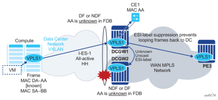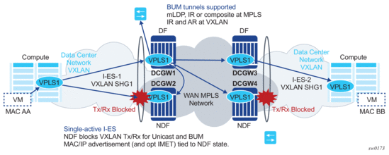 The I-ES DF PE for the service continues advertising IMET and MAC/IP routes for the associated VXLAN instance as usual, as well as forwarding on the DF VXLAN bindings. When the DF DC GW receives BUM traffic, it sends the traffic with the egress ESI label if needed.