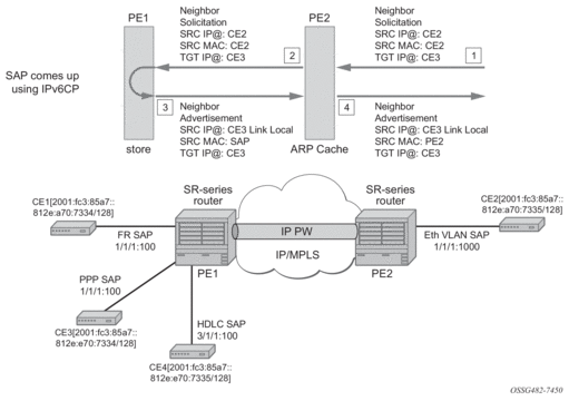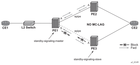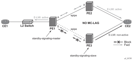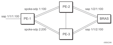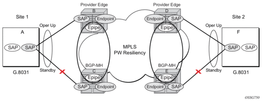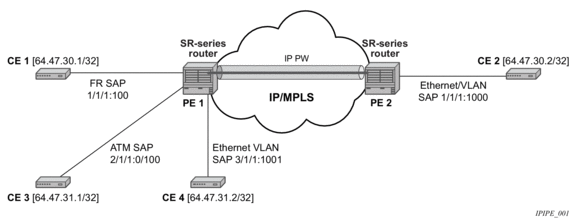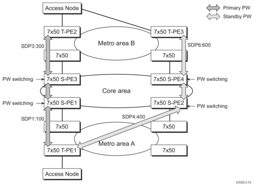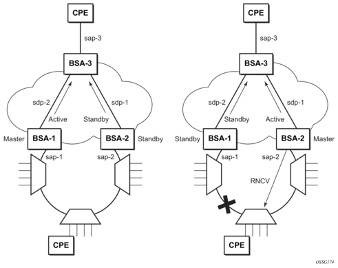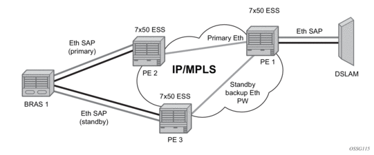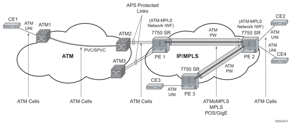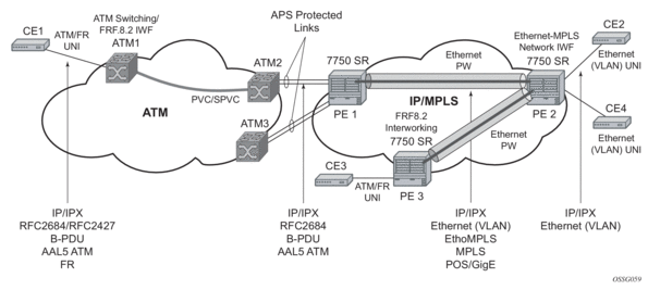 On the MSC-located SR connected to the Radio Network Controller (RNC), there is a standard pseudowire (Ethernet or ATM) that has an active pseudowire by IP/MPLS, but the standby path is not IP/MPLS capable Therefore, the active/standby pseudowire concept is extended to allow standby to be an access SAP to an ATM network for ATM pseudowire or Ethernet (bridged over ATM) for ETH pseudowire.