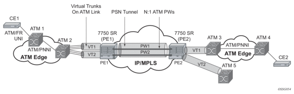 ATM virtual trunks use PWE3 N:1 ATM cell mode encapsulation to provide a cell-mode transport, supporting all AAL types, over the MPLS network. Cell concatenation on a pseudowire packet is supported. The SDP can be an MPLS or a GRE type.