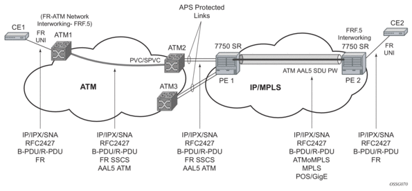 The endpoints of an AAL5 SDU mode VLL on a 7750 SR must be ATM VCs specified by port/vpi/vci. VPI/ VCI translation is supported. The endpoint can also be a FR VC, specified by port/dlci. In this case, FRF.5 FR-ATM network interworking is performed between the ATM VC SAP or the SDP and the FR VC SAP.