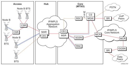 For example, the service pseudowires provider may use a 7705 SAR with one or two ATM E1 uplinks for real-time voice traffic and an Ethernet uplink connected to a DSL model for NRT data traffic. At the RNC site, a 7750 SR service router can be used, connected by ASAP (E1 IMA bundles) or STM-n ATM to the TDM/ATM network, and Ethernet to the DSL backhaul network.