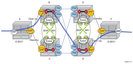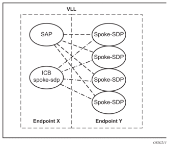 In this scenario, endpoint Y allows an ICB spoke-SDP as well as the primary spoke-SDP and secondary SAP. ICB operation is maintained as the current redundant pseudowire operation and the ICB spoke-SDP is always given an active status. The ICB spoke-SDP is only used if both the primary spoke-SDP and secondary SAP are not available. The secondary SAP is used if it is operationally up and the primary spoke-SDP pseudowire status is not active. Receive is enabled on all objects even though transmit is only enabled on one.