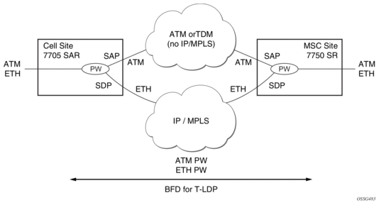 The ATM pseudowire is initiated using Targeted LDP (T-LDP) signaling as specified in RFC 4447, Pseudo-wire Setup and Maintenance using LDP. The SDP can be an MPLS or a GRE type.