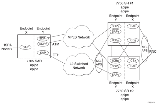 For HSDPA, Apipe and Epipe service termination on the SR where an endpoint-X SAP connects to the mobile RNC (by ATM or Ethernet) and an endpoint Y has a primary spoke-SDP and a secondary SAP on an SR ATM or ASAP MDA (with bridged PDU encapsulation for Epipes). The secondary SAP has the same restrictions as the SAP in endpoint-X for Apipe and Epipe, respectively.