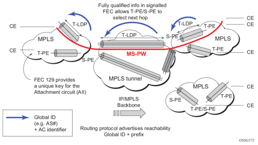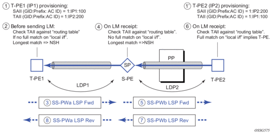 The ATM pseudowire is initiated using Targeted LDP (T-LDP) signaling (defined in RFC 4447, Pseudowire Setup and Maintenance using LDP). In this application, there is no ATM signaling on the gateway nodes since both endpoints of the MPLS network are configured by the network operator. ATM signaling between the ATM nodes is passed transparently over the VT (along with user traffic) from one ATM port on a PE to another ATM port on a remote (or the same) SR PE.