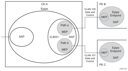 When using Ethernet tunnels, the Ethernet tunnel logical interface is created first. The Ethernet tunnel has member ports, which are the physical ports supporting the links. The Ethernet tunnel control SAPs carry G.8031 and 802.1ag control traffic and user data traffic. Ethernet service SAPs are configured on the Ethernet tunnel. Optionally, when tunnels follow the same paths, end-to-end services may be configured with fate shared Ethernet tunnel SAPs, which carry only user data traffic and share the fate of the Ethernet tunnel port (if correctly configured).