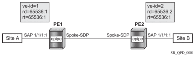 An Epipe with BGP VPWS enabled is configured on each PE. Site A is dual-homed to PE1 and PE2 with the remote PE (PE3) connecting to site B. An Epipe service is configured on each PE in which there is a SAP connecting to the local site.