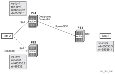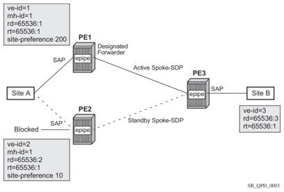 The pair of dual-homed PEs perform a designated forwarder election, which is influenced by configuring the site-preference. The winner, PE1 (based on its higher site-preference) becomes the active switch for traffic sent to and from site A, while the loser, PE2, blocks its connection to site A. Pseudowires are signaled using BGP between PE1 and PE3, and between PE2 and PE3. There is no pseudowire between PE1 and PE2; this is achieved by configuration. The active/standby pseudowires on PE3 are part of an endpoint automatically created in the Epipe service.